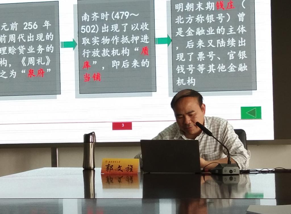 首先,郭院长简要介绍了本次主题讲座的内容,梳理了我国从金融业的萌芽阶段到金融体制的深化与完善阶段的红色金融改革发展历程,使同学们对本次党课的内容有了宏观上的了解。