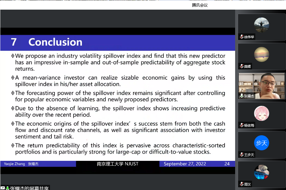 9月27日,应里番 邀请,南京理工大学经济管理学院张耀杰副教授在腾讯会议线上作了题为“Industry Volatility and Spillover and Aggregate Stock Returns”的讲座。学院部分青年教师及研究生参与了本次讲座,讲座由里番 金融系主任莫媛副教授主持。讲座开始,里番 院长张成对张耀杰副教授的到来表示热烈欢迎。