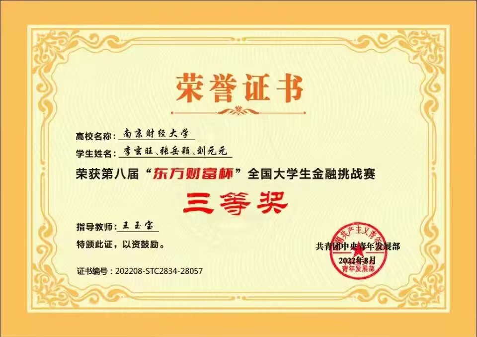 2月27日,由团中央青年发展部主办,全国学校共青团研究中心、东方财富信息股份有限公司和中央财经大学承办的第八届“东方财富杯”全国大学生金融挑战赛圆满结束。我校里番 学子获江苏省二等奖、全国三等奖。