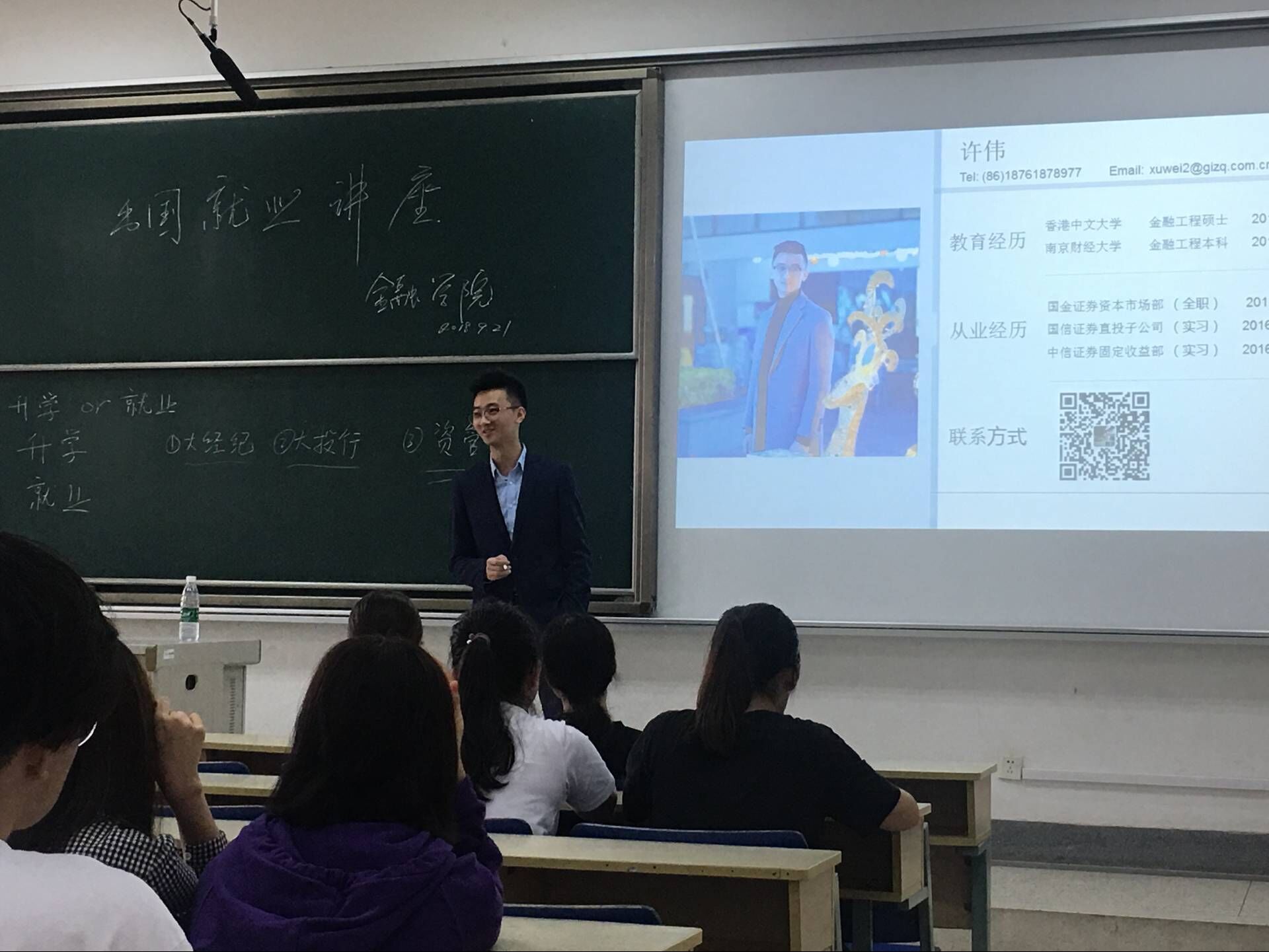 讲座一开始,许伟校友进行了自我介绍,回忆了其在里番 读本科、香港中文大学读硕士的历程以及在中信证券、国信证券、国金证券的实习及工作经历。接着,许伟校友从“升学or就业”、“升学选择”、“就业经验”三个方面进行了深入浅出的阐述。