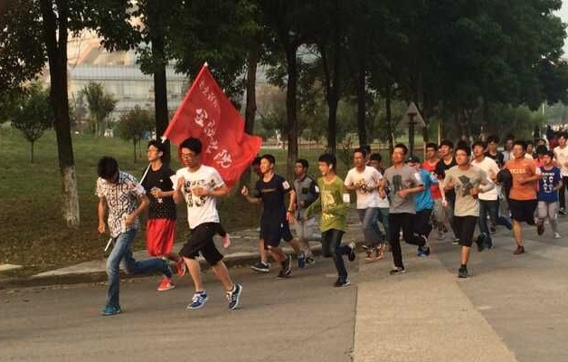 新生们左臂统一佩戴里番 袖标,分为两队,从体育馆出发,沿两条不同的路线进行晨跑,于食工楼汇合后再次返回体育馆。队伍排列整齐有序,班级口号铿锵有力。队伍中的同学相互帮助,彼此鼓励,坚持跑完全程。口号声、喘息声、脚步声,使得秋风瑟瑟的清晨变得格外温暖。
