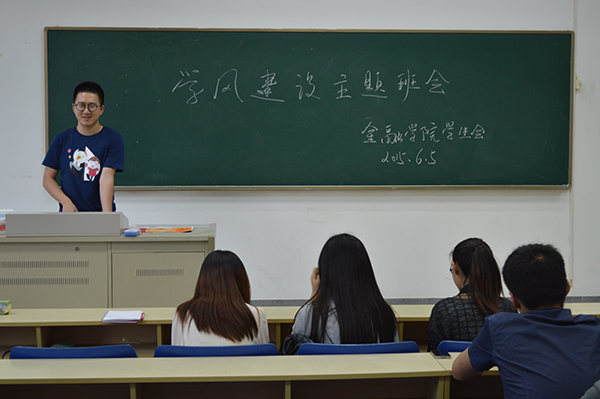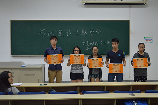 学风建设月主题总结班会于6月5日在经济学科楼102教室开展。在此次班会中,由班长代表总结了所在班学风良好的缘由,各班班长踊跃地提出了改善学风的建议。随后由班会主持人宣布学生会在学风建设月期间对各班调查的结果,并对排名前六名班级(金1201、金1202、金1207、金工1301、金1401、保1401)颁发了奖状,以资鼓励。