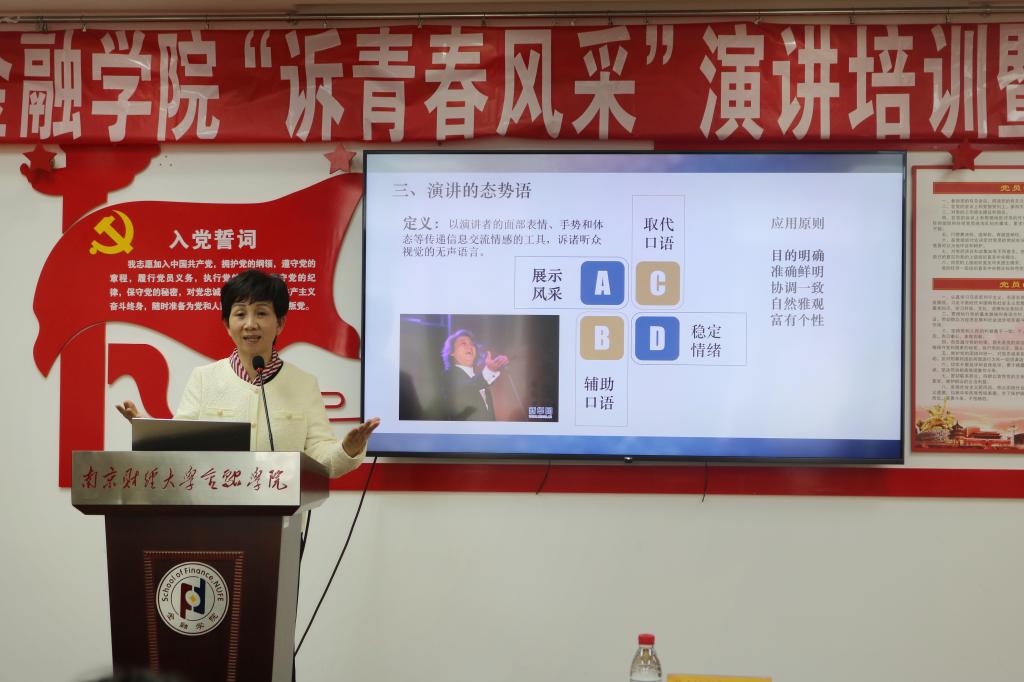 在“诉青春风采”演讲培训暨梦想公开课活动中,中国铁路上海局集团公司文联文协副主席陈静美老师受邀为获奖的同学们颁发荣誉证书,并为优秀选手进行了针对性的指导。接下来,陈静美老师为现场同学讲授了《诉青春风采》主题公开课。她结合自身的演讲成长经历和实战经验,为同学们讲解了演讲的基本技巧、注意事项和应对策略,帮助大家更好掌握演讲的精髓。讲座现场,师生积极互动,在欢声笑语中为金融学子们播下了一颗颗风采展示的种子。