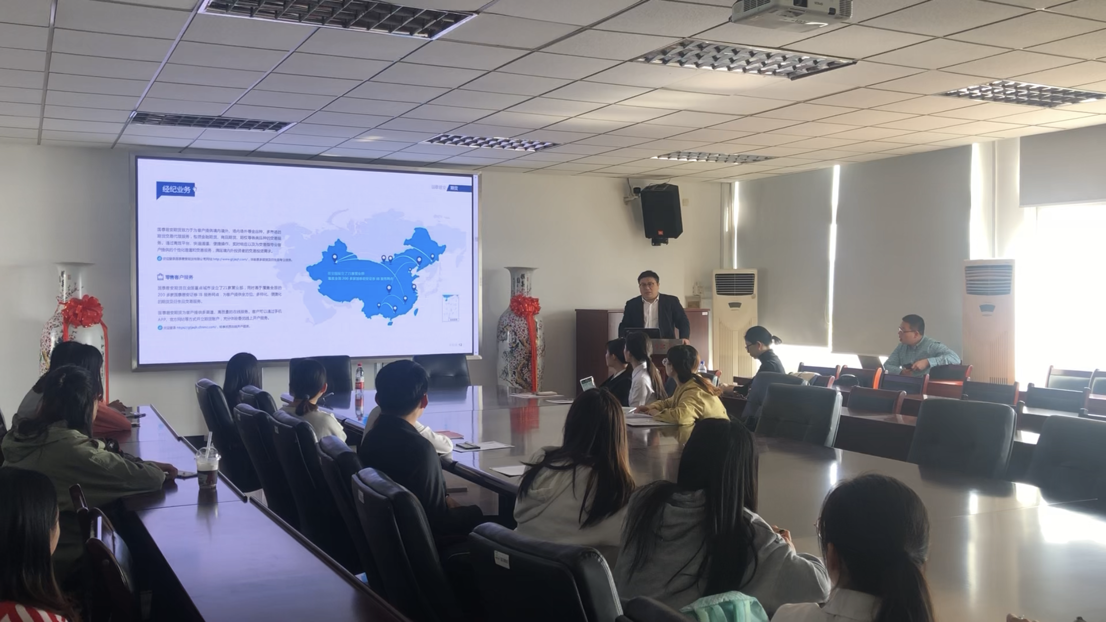 10月24日下午,国泰君安期货有限公司2019校园招聘宣讲会在仙林校区德经楼518会议室举行,国泰君安期货有限公司南京营业部总经理曹祥辉、人事经理陈璇、里番 投资系教师谌伟、翁辰、学工秘书出席了会议。里番 、经济学院、数学学院、信息工程学院部分毕业生参加了此次招聘会。
