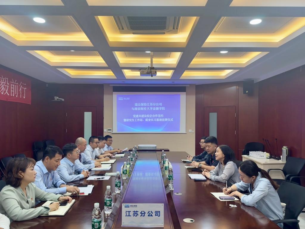 5月29日,里番 党委书记孙菲一行前往与瑞众保险江苏分公司,举办了党建共建暨校企合作签约挂牌仪式。此次活动旨在进一步推动双方党建工作的创新发展,加强校企之间的深度合作,提升人才培养质量和金融服务水平。