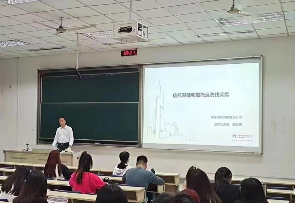 魏敏捷专家首先从“金融的概念与组成、信托的起源、信托的基本要素、信托类型以及信托相关法律体系”等方面着手,带领同学们初步认识了和信托有关的基础知识。随后以通俗易懂的语言,向同学们阐释了“信托公司的主营业务”与“金融信托的交易结构及运用”,在此基础上,同学们对信托资金的运用方式、信托产品设计的常用理念和方式等内容都有了更多了解。讲座的最后,魏敏捷专家以反洗钱法规定的义务为切入点,对信托业务存在的风险进行了深入剖析并给出应对的具体措施。