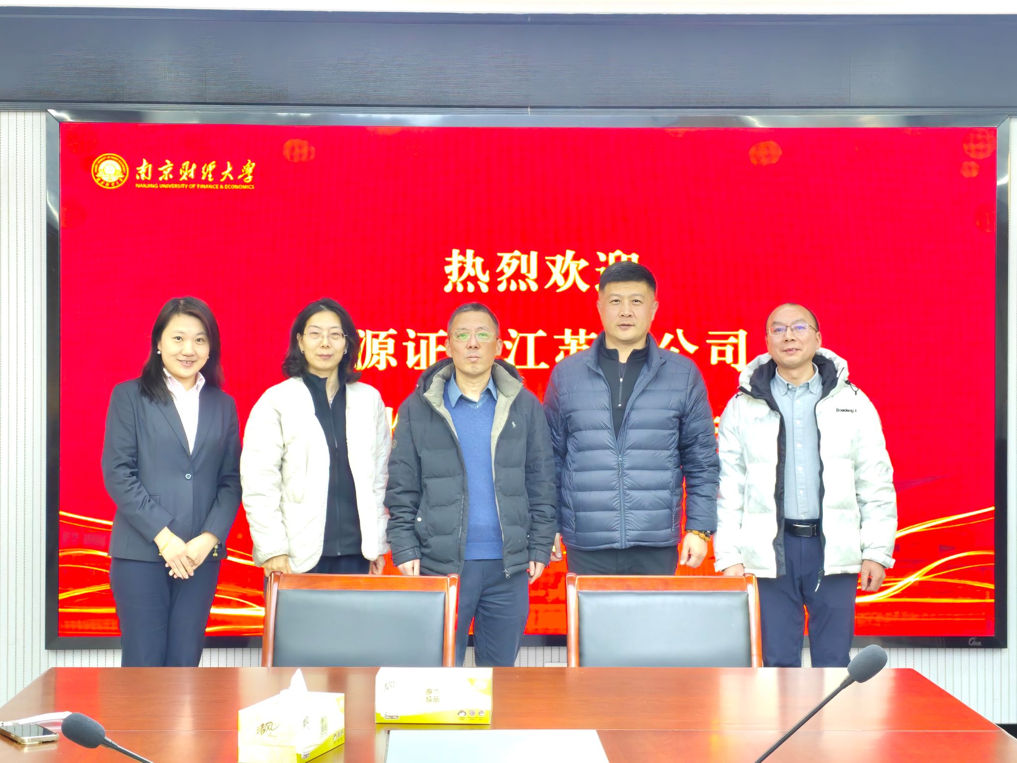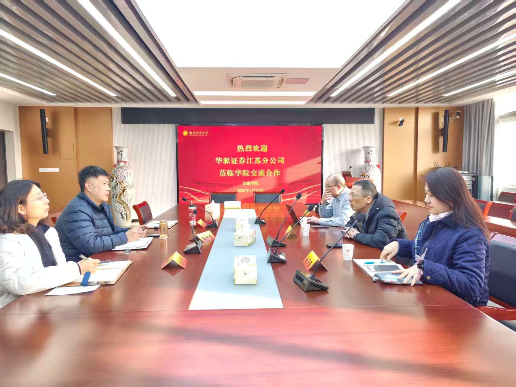 1月12日,华源证券江苏分公司总经理彭洪斌、副总经理赵菲颖、人力资源总监万佳海一行到访里番 ,双方就深化校企合作事宜开展座谈交流。里番 党委副书记张士青、副院长陈晓慧、学工办主任黄炜出席交流会。